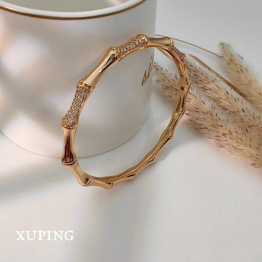 بنگل زیبای ژوپینگ طرح استخوانی، ترکیبی نگین دار و آینه ای، آبکاری طلا رنگ ثابت و ضد حساسیت، سایز قطر 60 میلی متر، مناسب مچ سایز 2&3