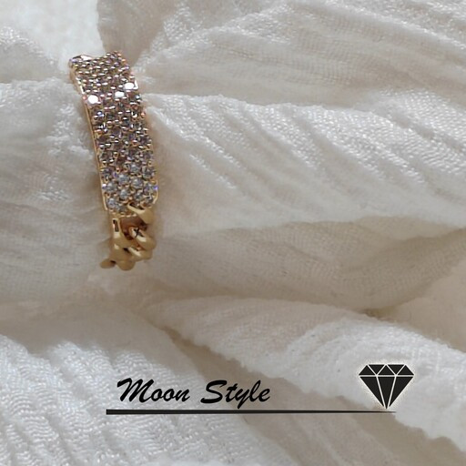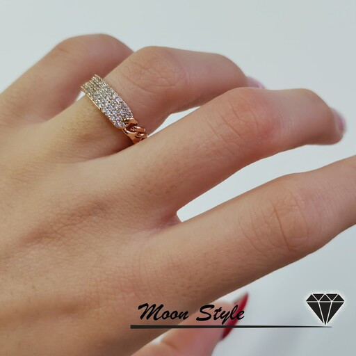 انگشتر پرکار نگینی ژوپینگ، پشت این حلقه بصورت زنجیر مدل کارتیه هست، کار فوق العاده خاص و منحصر به فرد، آبکاری طلا رنگ ثابت و ضد آب و ضد حساسیت در دو سایز 6 و 7