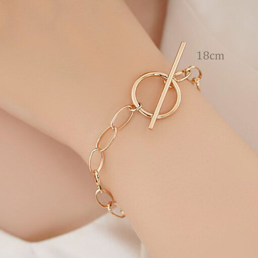 دستبند زنجیری قفل تی ژوپینگ درشت بافت، رنگ ثابت و ضد حساسیت، آبکاری طلا، سایز داخل عکس مشخص شده است نحوه ی نگهداری و شستشو:در برخورد با مواد شیمیایی قرار نگیرد